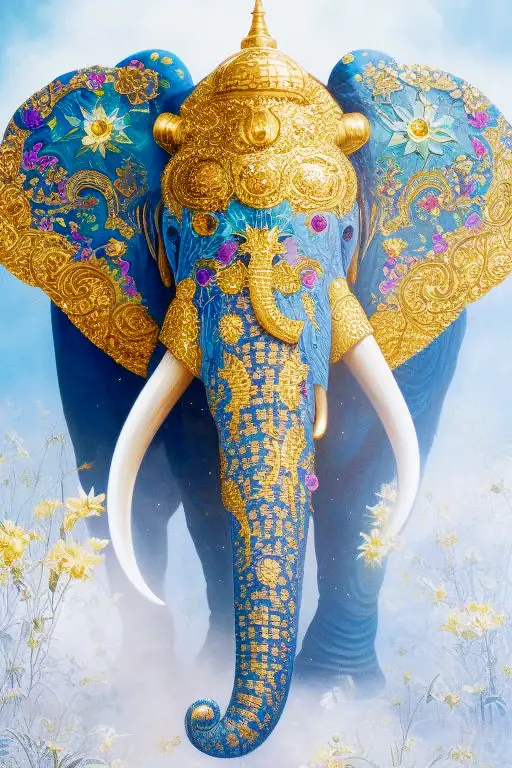 Your elephant travels over a road that is covered in lotus flowers and leaves. The way your elephant walks is charming and pleasing. As it steps forward, golden bells, sweet in tone, are heard. The sound is like an orchestra.