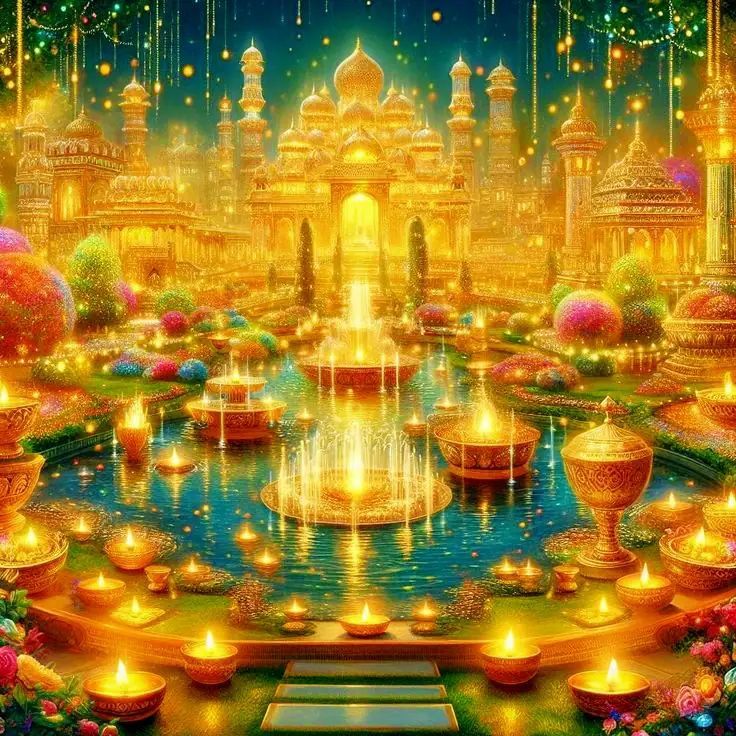 Devata, you are very mighty and your beauty illuminates all the directions. Many gods and goddesses decorated with divine jewelry dance and sing to entertain you. You are superior to all of them in status and happiness. Your mansion is very beautiful. It is made of gold. You spend your time here very happily.