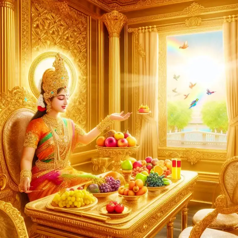Because of this meritorious deed, I have been born as a very beautiful goddess and enjoy all the wonderful things that delight my heart.